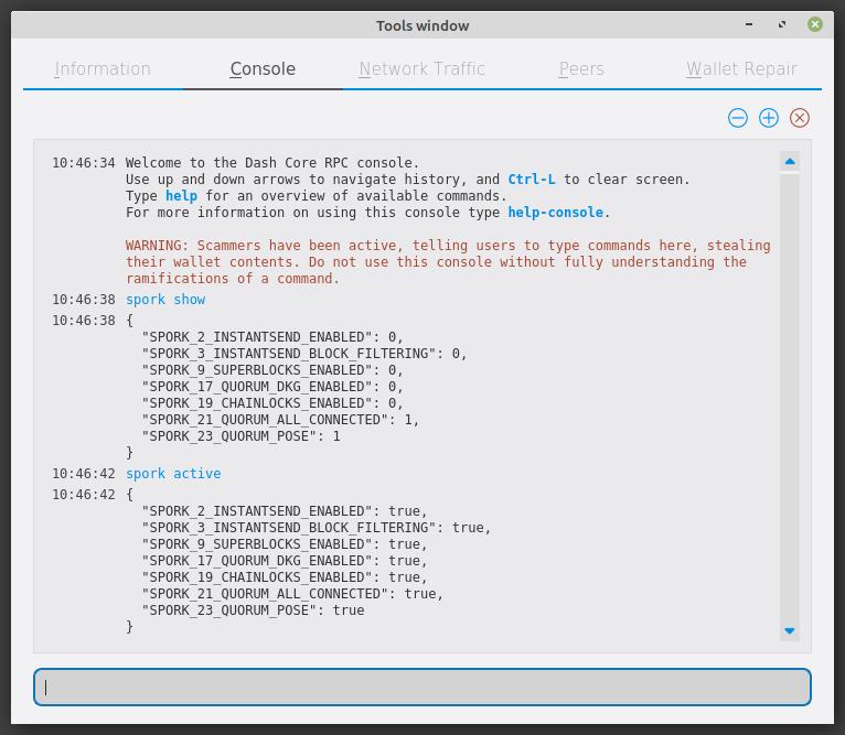 spork show and spork active output in the Dash Core debug console#