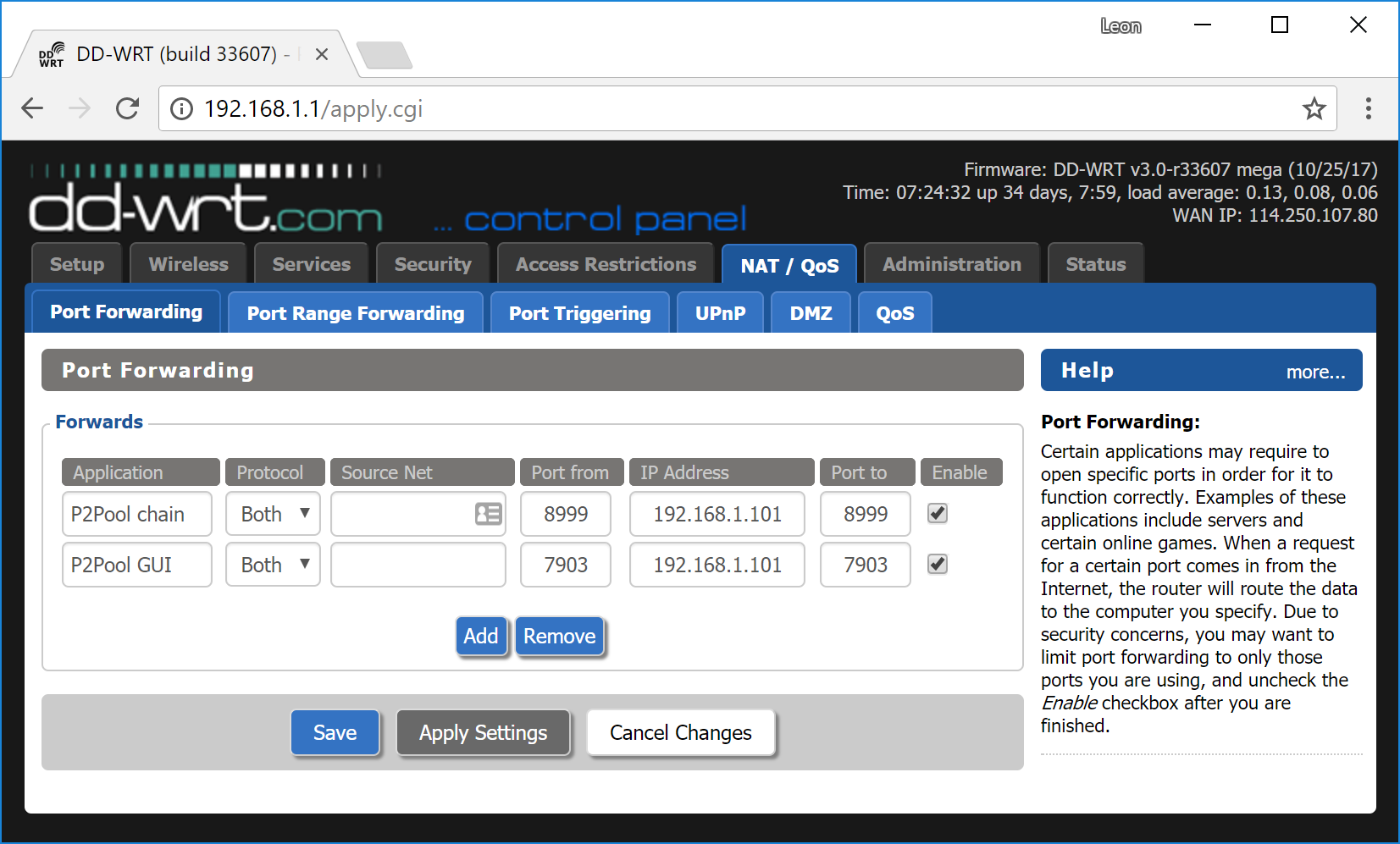 If you are on a private network behind a router, you will need to set up port forwarding for at least port 8999 (UDP/TCP) for access to the sharechain, as well as port 7903 (UDP/TCP) if you want your node to be accessible to the public. How this is done depends on your particular network router and is therefore beyond the scope of this documentation. An example from the popular DD-WRT open source router distribution is shown below. Guides to setting up port forwarding can be found here and here.