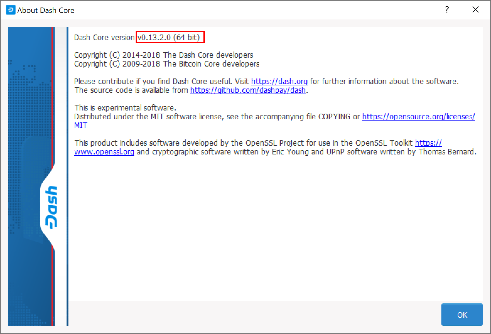 One of the most common wallet backup formats is a wallet.dat file from Dash Core wallet. Before you begin, make absolutely sure that you have a copy of this file stored somewhere safe in case the restore process accidentally corrupts your wallet file! In most cases, wallet.dat backups will also be protected by a password, which you will need to know to regain access to your Dash funds. If you already have Dash Core installed, first ensure it has been updated to the latest version by clicking Help > About Dash Core. Compare this with the latest available version of Dash Core on the website as follows: